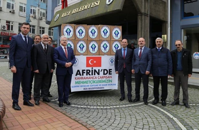 Rize Belediye Başkanı Prof. Dr. Reşat Kasap başta olmak üzere yardımcıları Saffet Kopuz ve Coşkun Yeğen, Meclis Başkan Vekili Sultan Yılmaz’ın katılımlarıyla gönderilen çaylar ilgili makamlar tarafından Mehmetçiğe ulaştırılacak. Operasyona katılan askerlerimizin daima yanlarında olduğunu ve dualarını eksik etmediğini ifade eden Rize Belediye Başkanı Prof. Dr. Reşat Kasap yapmış olduğu konuşmada, “Silahlı kuvvetlerimizin Afrin’de yapmış olduğu terörle mücadele çerçevesinde bizim de desteğimiz olsun istedik. Askerlerimizin çaylarının bir kısmını Rize Belediyesi’nden göndermek istedik. Vermiş oldukları mücadelede destek ve dualarımızın onlarla birlikte olduğunu ifade ediyoruz. Allah onların yardımcıları olsun. Rize Belediyesi yönetimi ve çalışanları adına bütüm Mehmetçiklerimize sevgi ve selamlarımızı iletiyoruz” dedi.