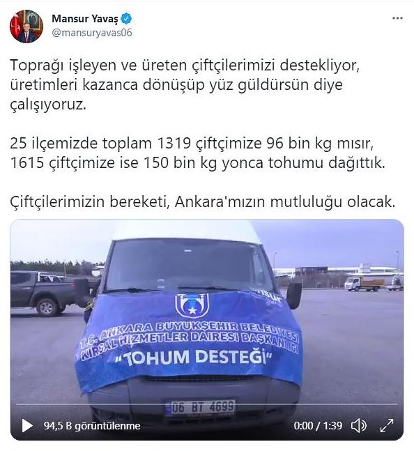 Ankara Büyükşehir Belediyesi kırsal kalkınma projesinde 25 ilçede toplam bin 319 çiftçiye mısır, bin 615 çiftçiye ise yonca tohumu dağıttı. Başkan Mansur Yavaş, “Toprağı işleyen ve üreten çiftçilerimizi destekliyor, üretimleri kazanca dönüşüp yüz güldürsün diye çalışıyoruz” dedi.