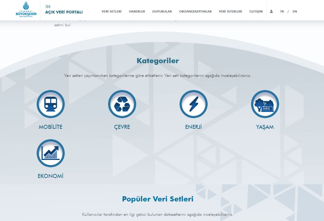 İstanbul Büyükşehir Belediyesi (İBB) Bilgi İşlem Daire Başkanlığı tarafından hayata geçirilen İBB Açık Veri Portalı hizmete açıldı. İBB Başkanı Ekrem İmamoğlu, “Zirve 2020″de portalın açılacağını duyurmuştu. İBB ve çevre kuruluşları tarafında yayımlanan verileri sunan Açık Veri Portalı ile kamunun şeffaflığının ve vatandaş katılımcılığının arttırılması amaçlanıyor. Kamusal hizmetlerde elde edilen verileri kullanarak vatandaşların da proje geliştirebileceği İBB Açık Veri Portalı’na https://data.ibb.gov.tr internet adresinden ulaşılabiliyor.