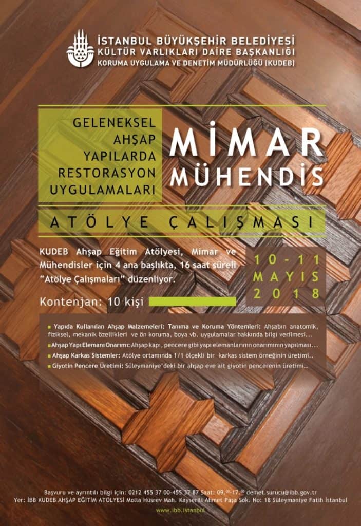 Atölyede konunun uzmanları tarafından, Yapıda Kullanılan Ahşap Malzemeleri Tanıma ve Koruma Yöntemleri anlatılacak. Ayrıca, Ahşap Yapı Elemanı Onarımı, Ahşap Giyotin Pencere Yapımı ve Ahşap Karkas Yapım Sistemleri ile ilgili sunumlar yapılacak.