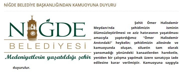 Niğde Belediyesi tarafından konuya ilişkin açıklama yaptı. Açıklamada, Şehit Ömer Halisdemir Meydanı’nda şehidin isminin ölümsüzleştirilmesi ve aziz hatırasının yaşatılması amacıyla anıt yaptırdıklarını belirtti. Açıklamada, “Heykelin, şehidimizin ailesinde ve kamuoyunda oluşan, siluetin tam olarak yansımadığı yönündeki kanaatlerden hareketle, yeniden bir çalışma yapılmak üzere sanatçıya iade edilmesine karar verilmiştir. Kamuoyuna saygıyla duyurulur” denildi.