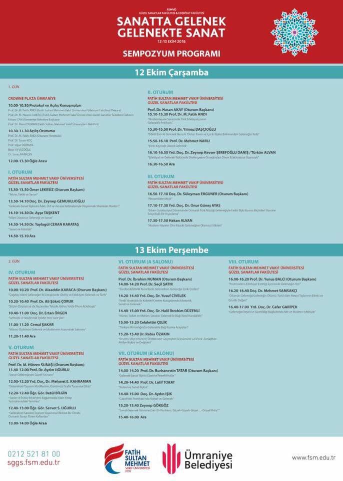 12 Ekim’de Ümraniye Crowne Plaza’da, saat 10.00’da açılışını yapacağımız sempozyumumuzun açılışı Crowne Plaza’da, oturumları ise Fatih Sultan Mehmet Vakıf Üniversitesi- Güzel Sanatlar Fakültesi’nde gerçekleşecek.